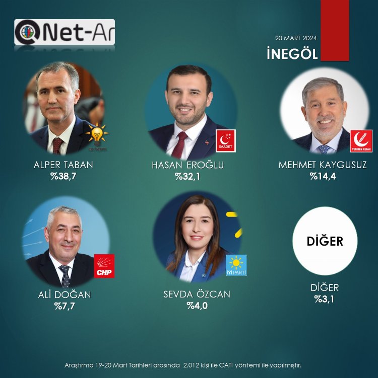 BURSA (İGFA) - Saadet Partisi İnegöl Belediye Başkan Adayı Hasan Eroğlu Net-Ar’ın 2012 kişiyle yaptığı ankette yüzde 32,1’lik puanı İnegöl’ü 31 Mart 2024 Mahalli İdareler seçimlerine kilitledi. İnegöl’de ağırlığı olan Milli Görüş’ün tek temsilcisi Saadet Partisi’nin seçmen gözündeki bu başarısı diğer 16 ilçe teşkilatını da tetikledi.