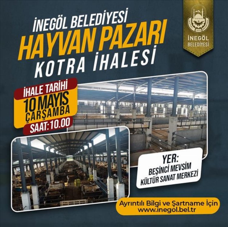 İnegöl Belediyesi Hayvan Pazarında Kurban Bayramı öncesi kotra ihalesinin kiralama işlemleri 10 Mayıs 2023 Çarşamba günü saat 10.00’da İnegöl Belediyesi Beşinci Mevsim Kültür Sanat Merkezi Çok Amaçlı Salonunda açık arttırma usulü ile gerçekleştirilecek.