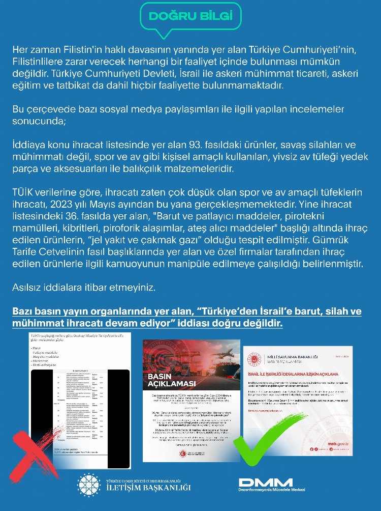 İletişim Başkanlığı Dezenformasyonla Mücadele Merkezi, Türkiye’den İsrail’e silah ve mühimmat ihracatı yapıldığı iddialarının gerçeği yansıtmadığını belirtti. İddiaya konu ihracat listesindeki ürünlerin mühimmat değil, kişisel amaçlı kullanılan av tüfeği aksesuarları ile balıkçılık malzemeleri olduğunu kaydetti.