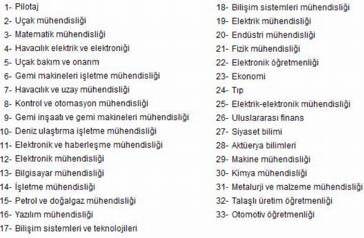 TÜİK'e göre lisans mezunları arasında aylık ortalama kazancı en yüksek olan beş bölüm sırasıyla; pilotaj, uçak mühendisliği, matematik mühendisliği, havacılık elektrik ve elektroniği, uçak bakım ve onarım oldu.