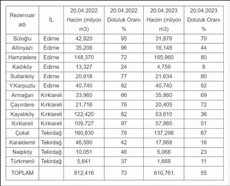 Barajların 20 Nisan 2022-20 Nisan 2023 doluluk oranları şöyle: