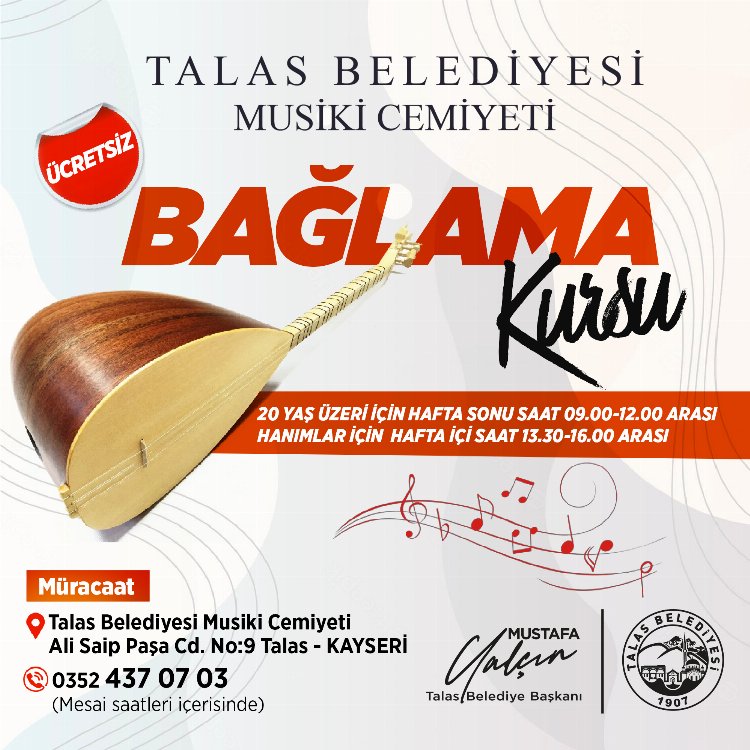 Kayseri'ye bağlı Talas’ın tarihi yerlerinden Kiçiköy Mahallesi Gölbaşı Meydanı Ali Saip Paşa Sokağındaki Talas Musiki Cemiyeti’nde verilecek bağlama kursuna 20 yaş üzeri herkes kayıt yaptırabilecek.