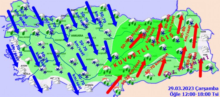 RÜZGAR: Rüzgarın, batı kesimlerde kuzey ve kuzeybatı, doğu bölgelerde güney yönlerden orta kuvvette, yer yer kuvvetli (50-70 km/saat), Doğu Karadeniz’in iç kesimleri ile Doğu Anadolu’nun kuzey ve doğusunda fırtına ve yer yer kuvvetli fırtına (70-100 km/saat) şeklinde esmesi bekleniyor.