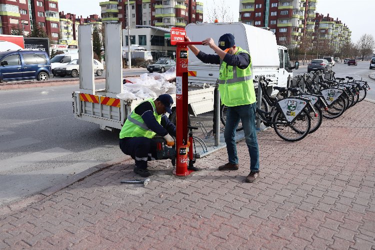 Konya Büyükşehir Belediyesi’nin bisikletlerin tamir edilmesi için kurduğu tamir istasyonları, bisiklet kullanıcılarına büyük kolaylık sağlıyor.