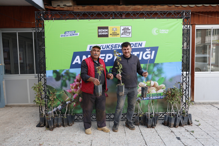 Konya Büyükşehir Belediyesi, kuraklığa dayanıklı ve yüksek katma değerli ürünlerin yaygınlaştırılması amacıyla mikro klima etkisine sahip bölgelerde başvuru yapan üreticiye Antep Fıstığı fidanı desteğinde bulunuyor.