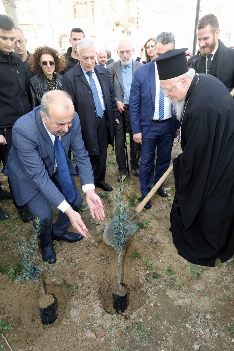 Konuşmalar sonrasında Başkan Türkyılmaz ve Patrik Bartholomeos, Tirilye'nin simge yapılarından olan Bursa Valiliği'nin kaynaklarıyla yerel belediye tarafından restore edilen Taş Mektep'in bahçesine barış ve kardeşliğin uzun sürmesi adına iki adet zeytin fidanını toprakla buluşturdu.