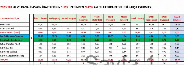 Söz konusu haberlerde 30 Büyükşehir Belediyesi arasında en yüksek su fiyatı olan ikinci kurum olarak MASKİ'nin gösterildiği anımsatılarak, "Yapılan haberde eksik veriler kullanılarak sadece su ve atıksu bedelleri dikkate alınmıştır. Ancak su faturalarına bu iki bedel ile birlikte bakım bedelleri ve diğer ücret kalemleri de yansıtılmaktadır. Bu bedeller hesaba katılarak yapılan 1 metreküplük suyun maliyetine göre 30 Büyükşehir içerisinde Manisa, 11. sırada yer almaktadır. Yapılan değerlendirme en yüksek ücret tarifesinin olduğu 1. Gruba göre yapılmıştır. Diğer gruplar baz alındığında ise Manisa, çok daha alt sıralardadır" denildi.