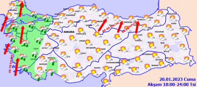 Parçalı ve çok bulutlu, Kıyı Ege ile Kütahya, Uşak ve Denizli çevrelerinin aralıklı sağanak yağışlı geçeceği tahmin ediliyor. Yağışların; öğleden sonra Kıyı Ege'de yerel kuvvetli olması bekleniyor. Rüzgarın; güney ve güneybatı yönlerden kuvvetli (40-60 km/saat), yer yer kısa süreli fırtına şeklinde (50-70 km/saat) esmesi bekleniyor.