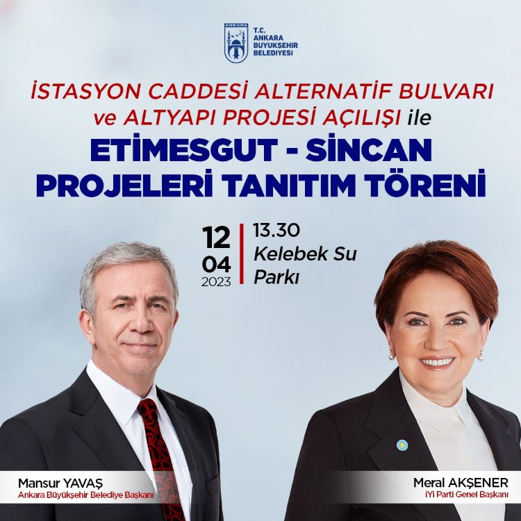 30 yıldır çözüm bekleyen trafik çilesi ve altyapı sorunları nedeniyle sel ve su baskınlarının yaşandığı İstasyon Caddesi’nde hayata geçirilen Alternatif Bulvar ve Altyapı Projesi’nin açılışının ve Etimesgut-Sincan projelerinin tanıtımının gerçekleştirileceği tören; ABB Başkanı Mansur Yavaş’ın ev sahipliğinde ve İYİ Parti Genel Başkanı Meral Akşener’in katılımıyla düzenlenecek.