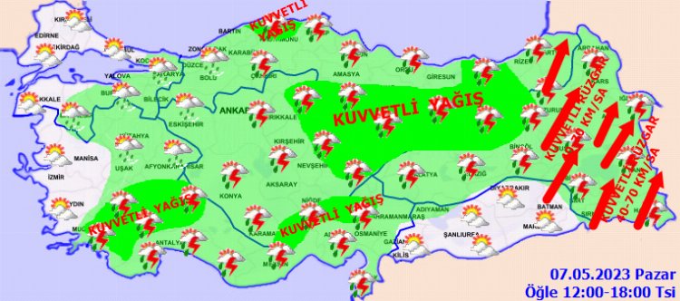 KUVVETLİ YAĞIŞ UYARISI: Yağışların; Batı Akdeniz’in iç kesimleri, İç Anadolu’nun kuzeydoğusu, Muğla, Denizli, Tokat, Trabzon, Gümüşhane, Bayburt, Erzincan ve Tunceli çevreleri, Kastamonu’nun kıyı kesimleri ile Doğu Akdeniz’in Toroslar kesiminde yer yer kuvvetli olması beklendiğinden yaşanabilecek sel, su baskını, yıldırım, ulaşımda aksamalar, yağış anında kuvvetli rüzgar, yerel dolu yağışı gibi olumsuzluklara karşı dikkatli ve tedbirli olunmalıdır.