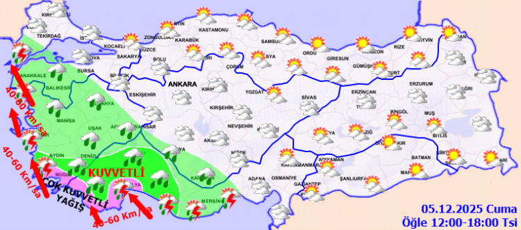 ANKARA (İGFA) - Meteoroloji Genel Müdürlüğü’nden yapılan son açıklamaya göre, 5 Aralık 2025 Cuma günü sabah saatlerinden itibaren bazı bölgelerde kuvvetli ve yer yer şiddetli yağışlar görülecek.