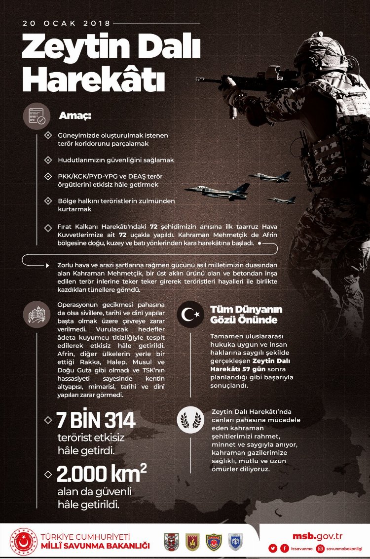 5 yılın özetini de inografik olarak sosyal medya hesabından paylaşan Milli Savunma Bakanlığı, 7 bin 314 teröristin etkisiz hale getirilirken, 2 bin kilometrekarelik alanın da güvenli hale getirildiğini kaydetti.
