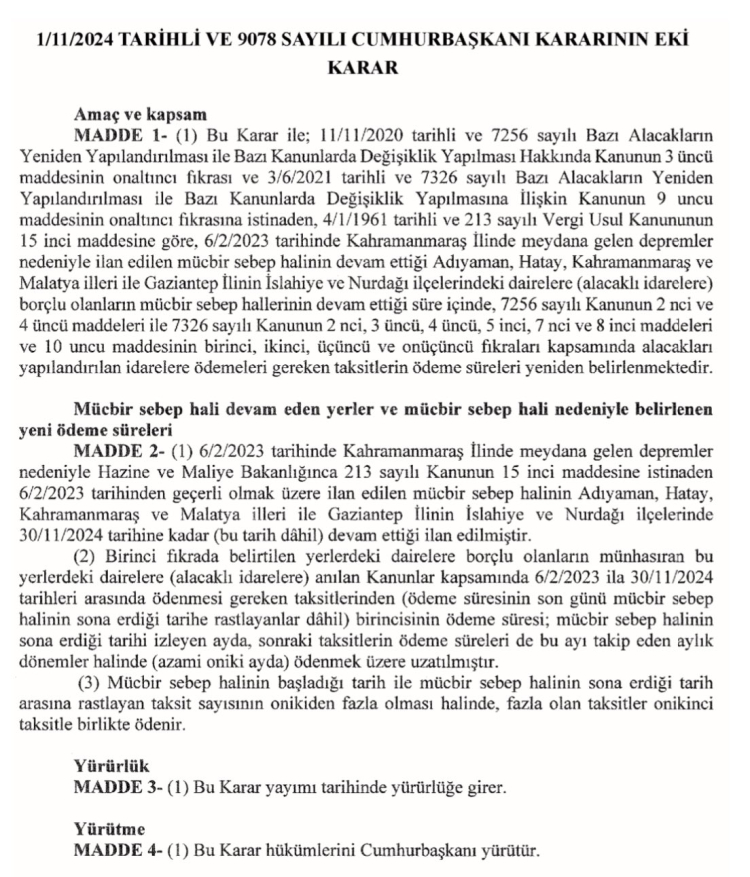 Kahramanmaraş merkezli depremlerden etkilenen 4 il ve 2 ilçedeki mükelleflerin, yapılandırma başvuru ile ödeme süreleri Cumhurbaşkanı Kararı ile uzaltıldı. Karar bugünkü Resmi Gazete'de yayımlandı. 30 Kasım 2024 tarihleri arasında ödenmesi gereken taksitlerin süresi azami 12 ay uzatıldı.