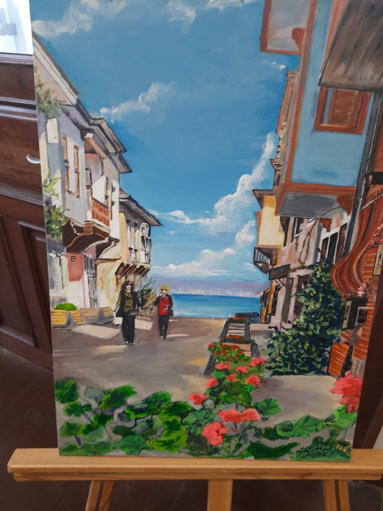 Mudanya Belediyesi'nin desteklediği ve geliri Türkiye Yardım Sevenler Derneği (TYSD) Mudanya Şubesi'ne bağışlanarak depremzedelere gidecek olan Mudanya-Tirilye temalı sergide 40 yağlı boya tablo görücüye çıktı.