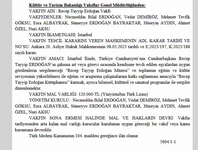 Recep Tayyip Erdoğan Vakfı kuruluşuna ilişkin Vakıflar Genel Müdürlüğü ilanı, Resmî Gazete'de yayımlandı.