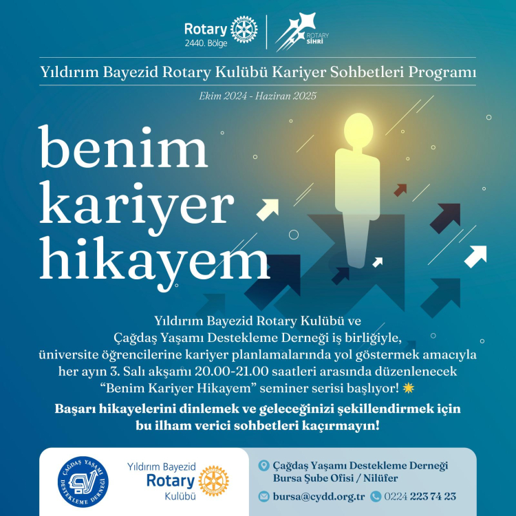 Yıldırım Bayezid Rotary Kulübü, üniversite öğrencisi gençlerin kariyer planlamasına yön vermek üzere kolları sıvadı. Çağdaş Yaşamı Destekleme Derneği ile bu yıl ilk kez imzalanan protokol çerçevesinde Ekim ayında başlayacak olan “BENİM KARİYER HİKAYEM” Kariyer Sohbetleri Projesi ile kulüp üyesi, farklı meslek uzmanı Rotaryenler, üniversite düzeyindeki öğrencilerle, öğrencilik sonrası kariyer hikayelerinin nasıl şekillendiğini paylaşarak, gençlere vizyon kazandırmayı ve çalışma hayatı için motivasyon oluşturmayı hedefliyor.