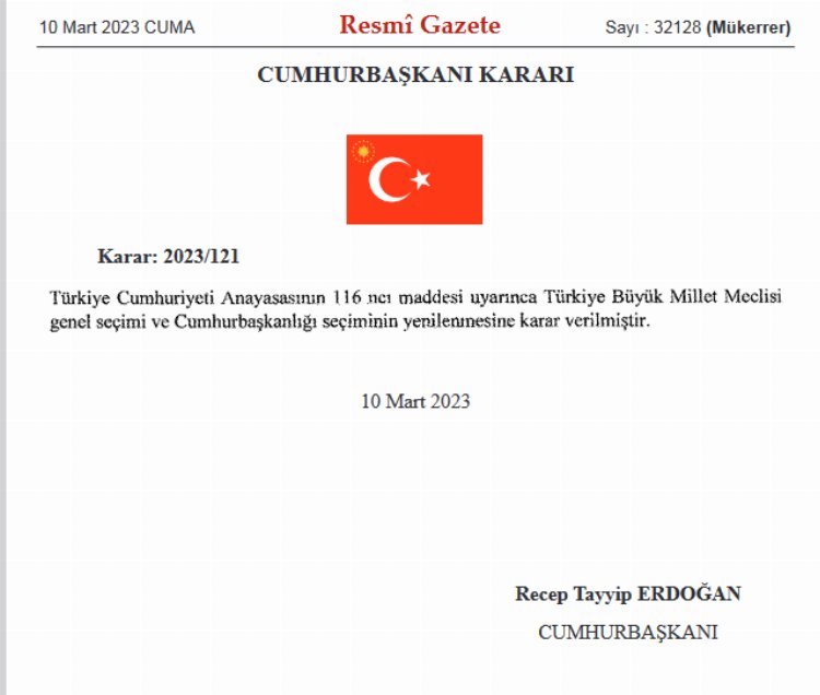 14 Mayıs tarihinde yapılacak seçimlere ilişkin Cumhurbaşkanı Kararı bugünkü Resmi Gazete'nin mükerrer sayısında yayımlandı.