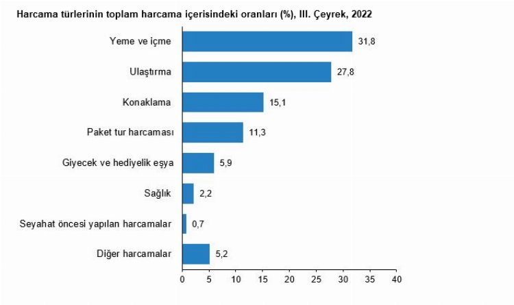 Bu çeyrekte harcama türlerinin toplam seyahat harcamaları içerisindeki dağılım oranları incelendiğinde en fazla paya yüzde 31,8 ile yeme ve içme harcamaları, yüzde 27,8 ile ulaştırma harcamaları ve yüzde 15,1 ile konaklama harcamaları sahip oldu. Bu harcama türlerinin geçen yılın aynı dönemine göre değişim oranları incelendiğinde ise yeme ve içme harcamalarında yüzde 108,5, ulaştırma harcamalarında yüzde 155,8 ve konaklama harcamalarında ise yüzde 110,1'lik artış görüldü.