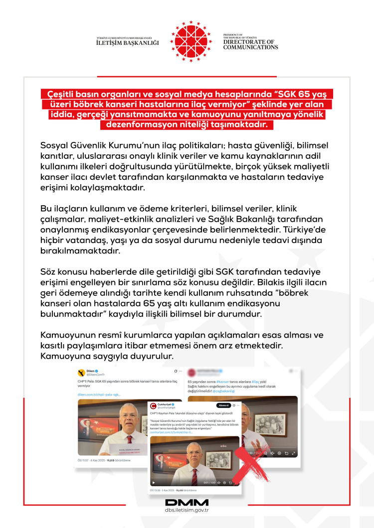 ANKARA (İGFA) - İletişim Başkanlığı Dezenformasyonla Mücadele Merkezi, sosyal medyada ve bazı basın organlarında yer alan “SGK 65 yaş üzeri böbrek kanseri hastalarına ilaç vermiyor” iddialarının gerçeği yansıtmadığını duyurdu. Kurum açıklamasında, söz konusu paylaşımların kamuoyunu yanıltmaya yönelik olduğu vurgulandı.