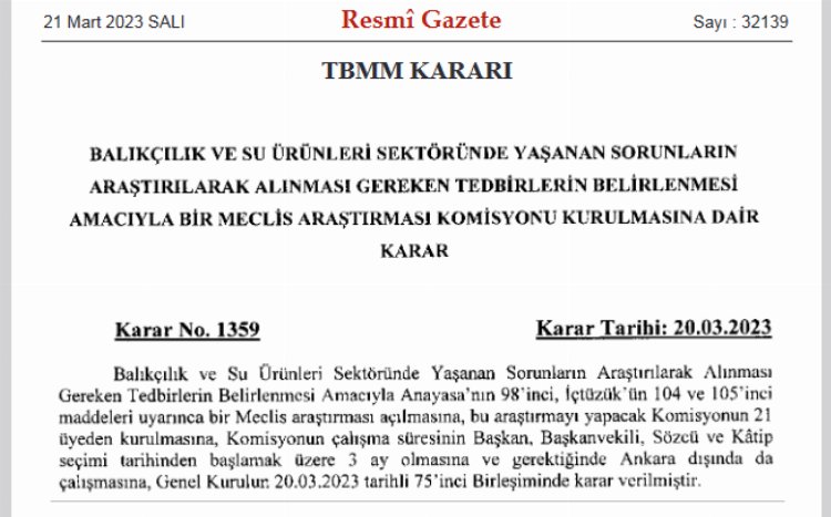 Balıkçılık ve su ürünleri sektörünün sorunlarını tespit etmek üzere Meclis araştırma komisyonu kuruldu.