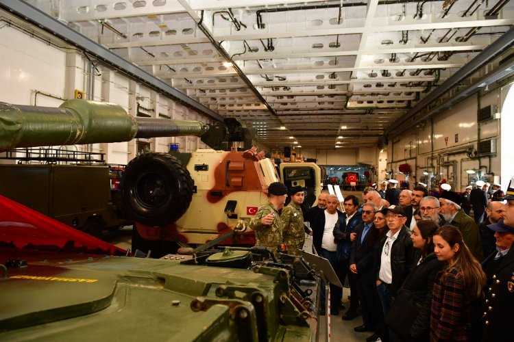 İçinde, dünyanın ilk silahlı insansız hava aracının da (SİHA) yer aldığı TCG Anadolu'ya askeri görevliler tarafından içeri alınan vatandaşlar, günün anısına hatıra fotoğrafı çektiriyor.