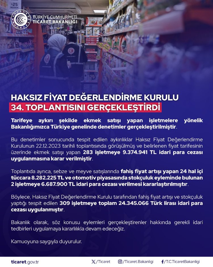 Tarifiye aykırı şekilde ekmek satışı yapan işletmelere yönelik ülke genelindeki denetimlerde, fiyat tarifesi üzerinde satış yapan 283 işletmeye 9 milyon 374 bin 941 TL idari para cezası uygulanmasına karar verildi. Fahiş fiyat artışı yapan 24 hal içi tüccara 8 milyon 282 bin 225 TL ve otomotiv piyasasında stokçuluk eyleminde bulunan 2 işletmeye de 6 milyon 687 bin 900 TL idari para cezası verilmesi kararlaştırıldı.