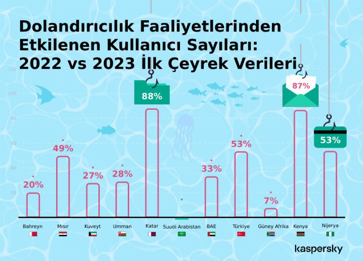 Sosyal mühendislik siber saldırılarını derinlemesine inceleyen Kaspersky, META bölgesinde en yaygın olan kimlik avı saldırıları hakkında bilgiler paylaştı. 2022 yılının ilk çeyreği ile 2023'ün ilk çeyreği karşılaştırıldığında, Mısır (%49), BAE (%33), Katar (%88), Umman (%28), Kuveyt (%27) ve Bahreyn (%20) özelindeki kullanıcılara yönelik kimlik avı saldırılarında artışlar tespit edildi. Öte yandan, Suudi Arabistan'daki kimlik avı saldırılarında, 2022'nin aynı dönemine kıyaslandığında bu senenin ilk çeyreğinde %1'lik hafif bir gerileme yaşandığı görüldü.