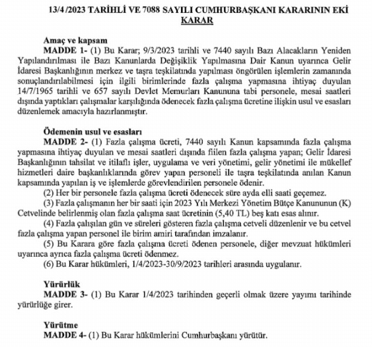 Yeniden yapılandırma kapsamında Gelir İdaresi Başkanlığı'nın merkez ve taşra teşkilatındaki işlemlerin zamanında sonuçlandırılabilmesi amacıyla ilgili birimlerde çalışanlar için fazla mesai ücret ayarı yapıldı. Ayda 50 saati geçemeyecek olan olan personele fazla mesai ücreti uygulaması 30 Eylül'e kadar sürecek.
