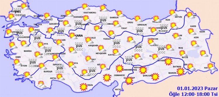 Yeni yılın ilk gününde ülke genelinde yağış beklenmiyor. Güneybatı kesimlerin parçalı bulutlu, diğer yerlerin az bulutlu ve açık geçeceği tahmin ediliyor. Marmara Bölgesi ile iç ve doğu kesimlerde yer yer pus ve sis hadisesi bekleniyor.