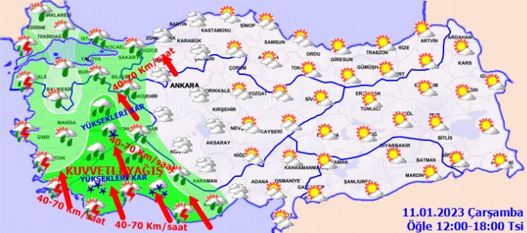 Türkiye'nin iç ve batı kesimlerinin parçalı ve çok bulutlu, Marmara, Ege, Batı Akdeniz, İç Anadolu ve Batı Karadeniz'in batısı ile Mersin ve Karaman çevrelerinin yağmur ve sağanak yağışlı, İç Ege ile Batı Akdeniz’in yükseklerinin karla karışık yağmur ve kar yağışlı, diğer yerlerin az bulutlu ve açık geçeceği tahmin ediliyor.