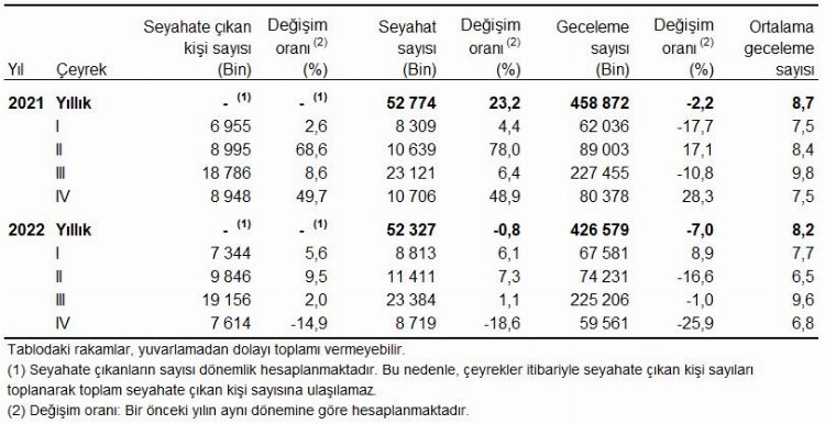 Ekim, Kasım ve Aralık aylarından oluşan 2022 yılının son çeyreğinde; yurt içinde ikamet eden 7 milyon 614 bin kişi seyahate çıktı. Seyahate çıkanların bir ve daha fazla geceleme kaydı ile ülke içinde yaptıkları toplam seyahat sayısı bir önceki yılın aynı çeyreğine göre yüzde 18,6 azalarak 8 milyon 719 bin seyahat olarak gerçekleşti. Bu çeyrekte seyahate çıkanlar 59 milyon 561 bin geceleme yaptı. Ortalama geceleme sayısı 6,8 gece oldu.