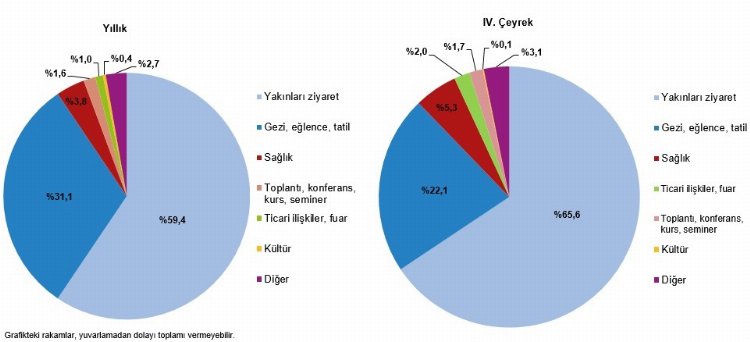 Verilerin yıllık değerlendirilmesinde toplam seyahat sayısı bir önceki yıla göre yüzde 0,8 azalarak 52 milyon 327 bin olarak gerçekleşti. Bu yılda seyahate çıkanların yaptıkları toplam geceleme sayısı bir önceki yıla göre yüzde 7 azalarak 426 milyon 579 bin olarak gerçekleşti. Ortalama geceleme sayısı 8,2 gece oldu.