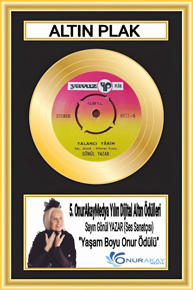 “Altın Plak” ve “Altın Mikrofon” gibi nostalji olmuş ödüllerin, Türkiye’de yeniden alanında başarılı sanatçılara verildiği OnurAkayMedya ödüllerinde, Yaşam Boyu Onur Ödülü’ne layık görülen usta sanatçı Gönül Yazar’a da “Altın Plak” verildi.