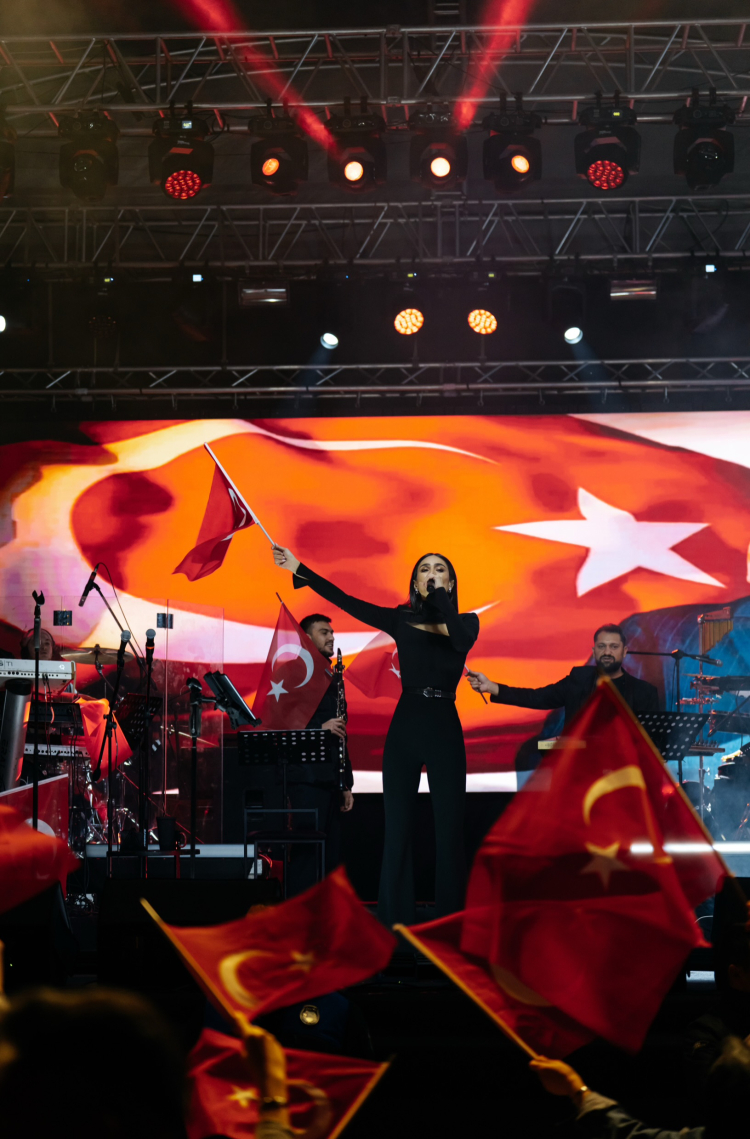 Elif Buse Doğan, sahnesinde hem repertuvarındaki sevilen şarkılarla hem de Cumhuriyet coşkusunu yansıtan eserleri seslendirerek izleyenlere unutulmaz bir gece yaşattı.