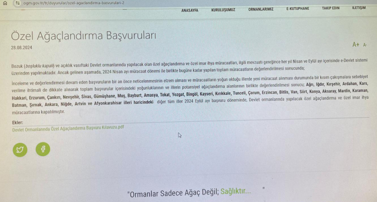 2021 yılından buyana Adıyaman, Ankara, Diyarbakır, Elazığ, Gaziantep, Hakkari, Kahramanmaraş, Kilis, Mardin, Nevşehir, Şanlıurfa, Uşak, Ağrı, Iğdır, Kırşehir, Ardahan, Kars, Erzurum, Çankırı, Nevşehir, Sivas, Gümüşhane, Muş, Bayburt, Amasya, Tokat, Yozgat, Bingöl, Kayseri, Kırıkkale, Tunceli, Çorum, Erzincan, Bitlis, Van, Siirt, Konya, Aksaray, Mardin, Karaman, Batman, Şırnak, Niğde, Artvin ve Afyonkarahisar illerinde Özel Ağaçlandırma projesine izin veriliyor.