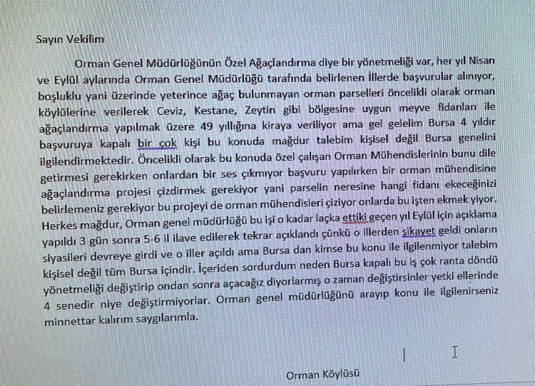 “Sayın Vekilim, Orman Genel Müdürlüğü’nün Özel Ağaçlandırma diye bir yönetmeliği var. Her yıl nisan ve eylül aylarında Orman Genel Müdürlüğü tarafından belirlenen illerde başvurular alınıyor, boşluklu yani üzerinde yeterince ağaç bulunmayan orman parselleri öncelikli olarak orman köylülerine verilerek ceviz, kestane, zeytin gibi bölgesine uygun meyve fidanları ile ağaçlandırma yapılmak suretiyle 49 yıllığına kiraya veriliyor. Ama gel gelelim Bursa 4 yıldır başvuruya kapalı. Bir çok kişi bu konuda mağdur. Talebim kişisel değil, Bursa genelini ilgilendiriyor…” diye devam ediyor.